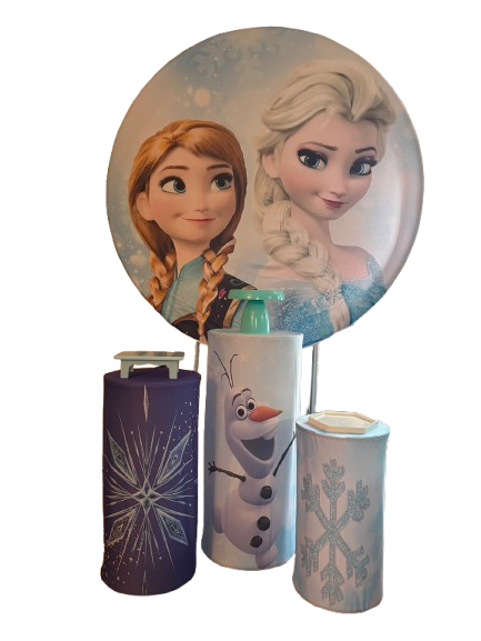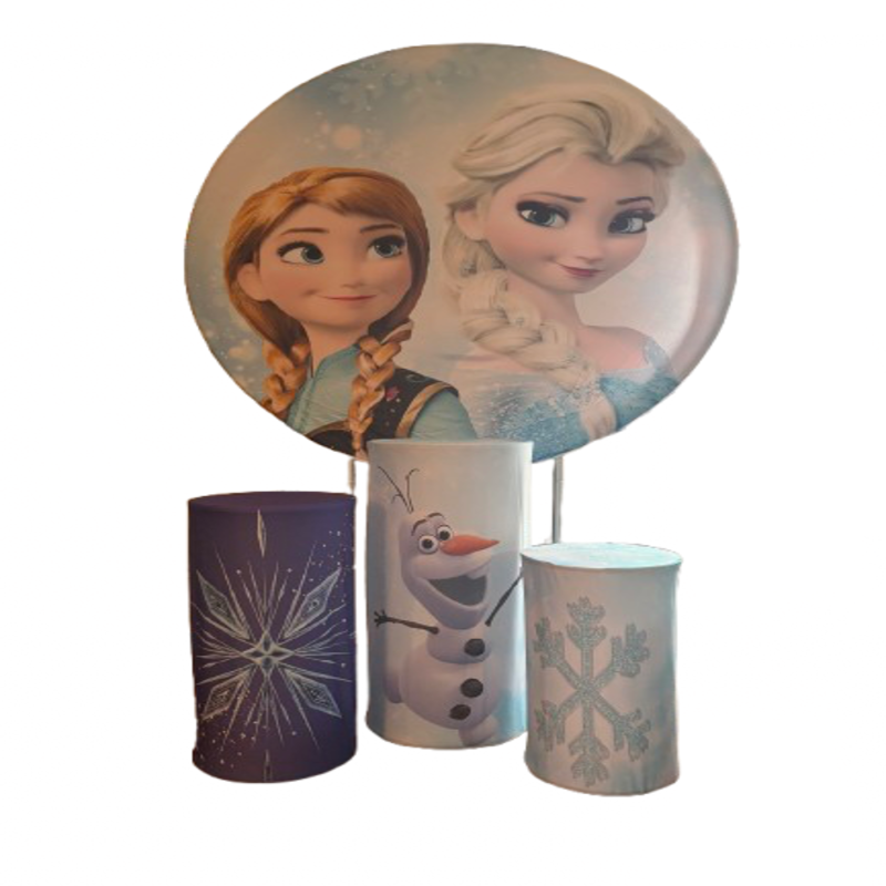This Frozen party backdrop includes a large round character panel along with three coordinating decorative cylinders. Together, they create visual depth and balance for your cake table or gift display.