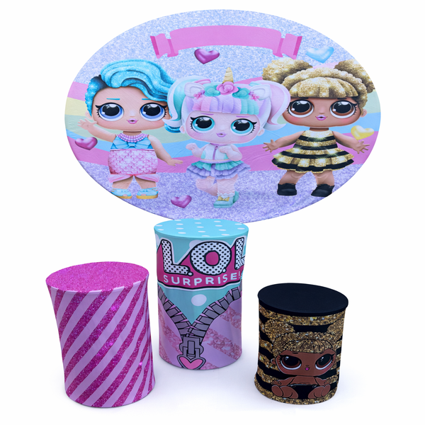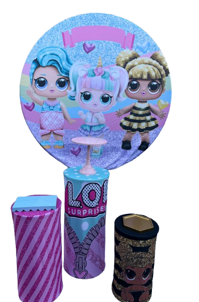This LOL Surprise party backdrop includes a large round panel featuring colorful LOL Surprise characters in a bright and playful design. The set also includes three decorative pedestals that complement the theme and enhance your party setup.