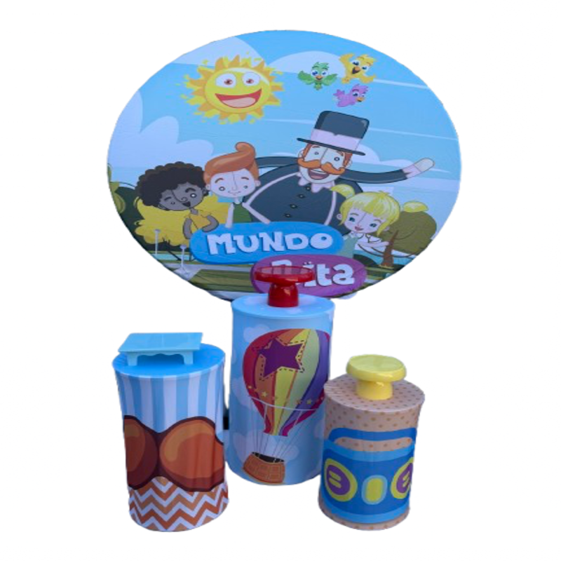 This Mundo Bita party backdrop includes a large round panel featuring the iconic characters and colorful scenery from the popular children’s show. Additionally, the set includes three decorative cylinders designed to complement the theme and highlight your dessert or cake table.