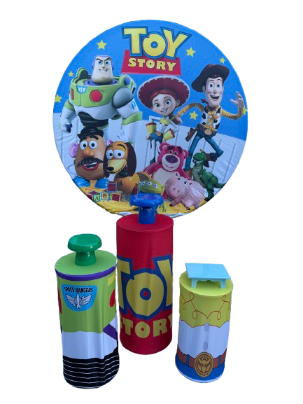 This Toy Story party backdrop includes a large round panel featuring the popular Toy Story characters in a vibrant scene. The set also includes three decorative pedestals that complement the theme and highlight your cake table.